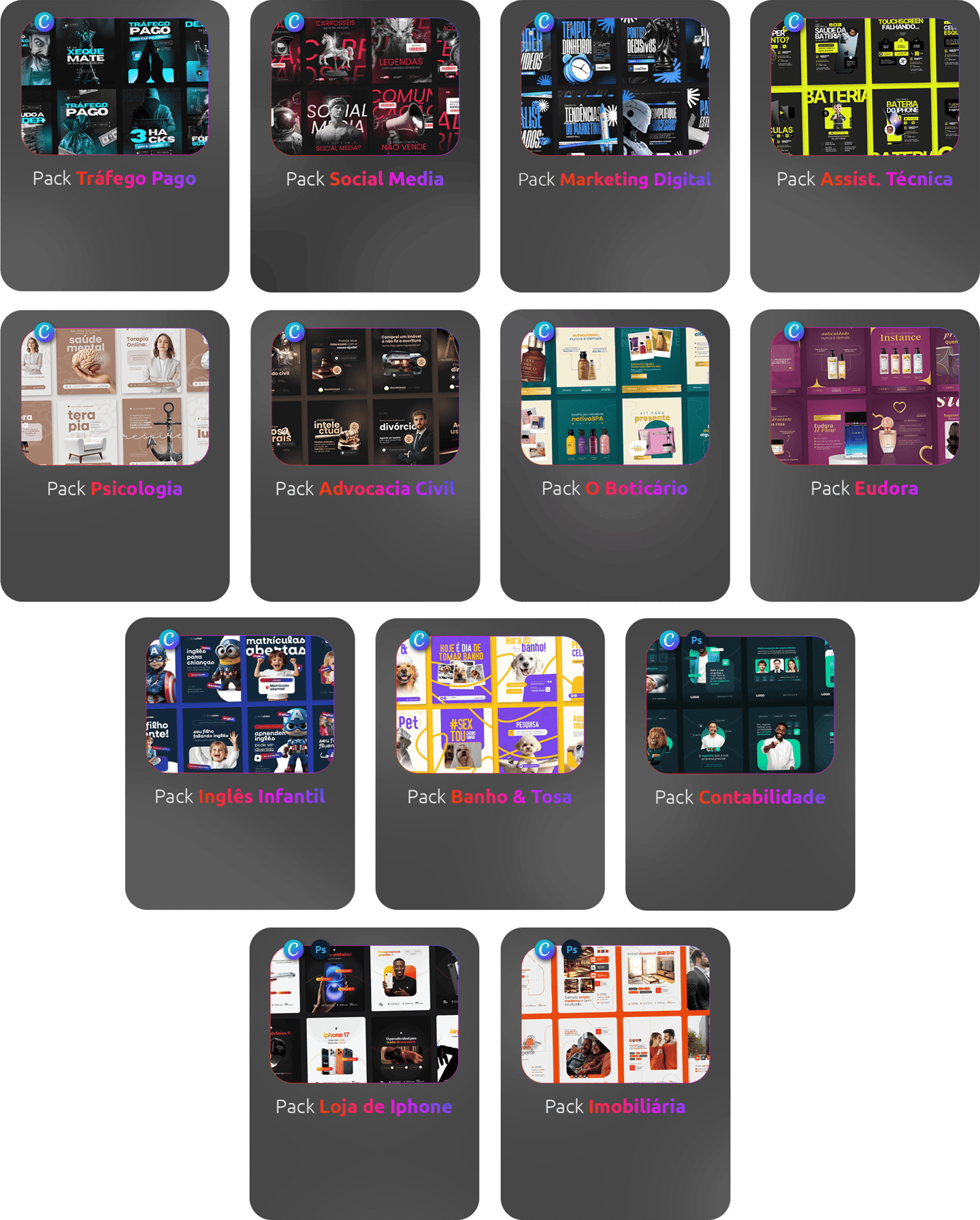 Os nossos packs são desenvolvidos com um padrão de qualidade que valoriza cada detalhe do design, garantindo um visual moderno, profissional e alinhado com as tendências.