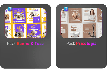 Todos os nossos packs contém 60 peças para feed com legendas prontas, 20+ peças para stories e 09+ capas de destaque. Todos packs têm aulas inclusas sobre acesso e edição.